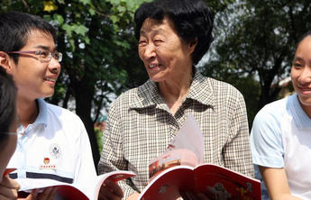 2009年9月4日,于漪(中)向上海市杨浦高级中学的学生们赠阅自己编写的爱国文学精品读本《我爱你,中国》。
