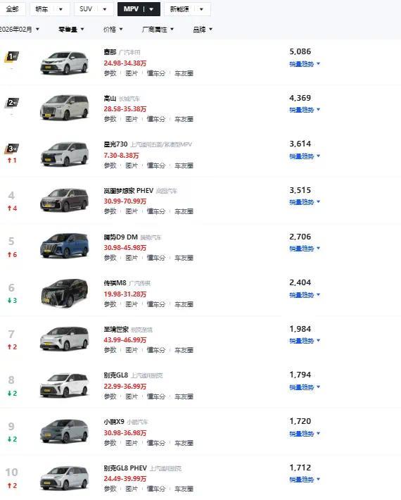 由于春节假期和消费淡季等多重因素影响,国内MPV市场整体表现较为低迷,销量榜前十名车型中甚至无一款突破6000辆,头部车型销量也普遍环比下滑,但从前十名排名表现来看,自主高端与新能源车型强势崛起,而传统合资MPV的市场份额持续被挤压,接下来我们就来看看前十名车型的销量表现吧。