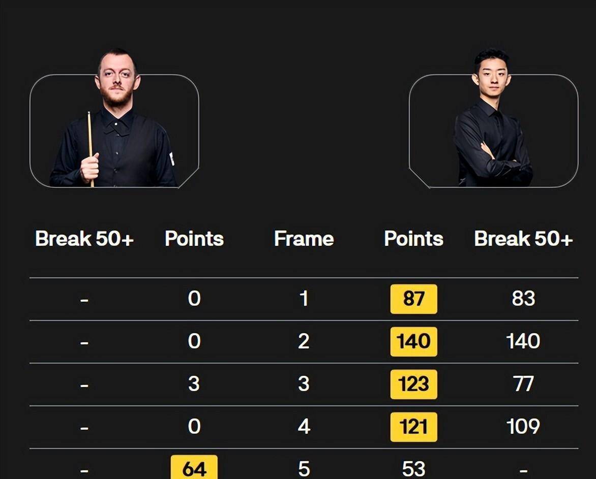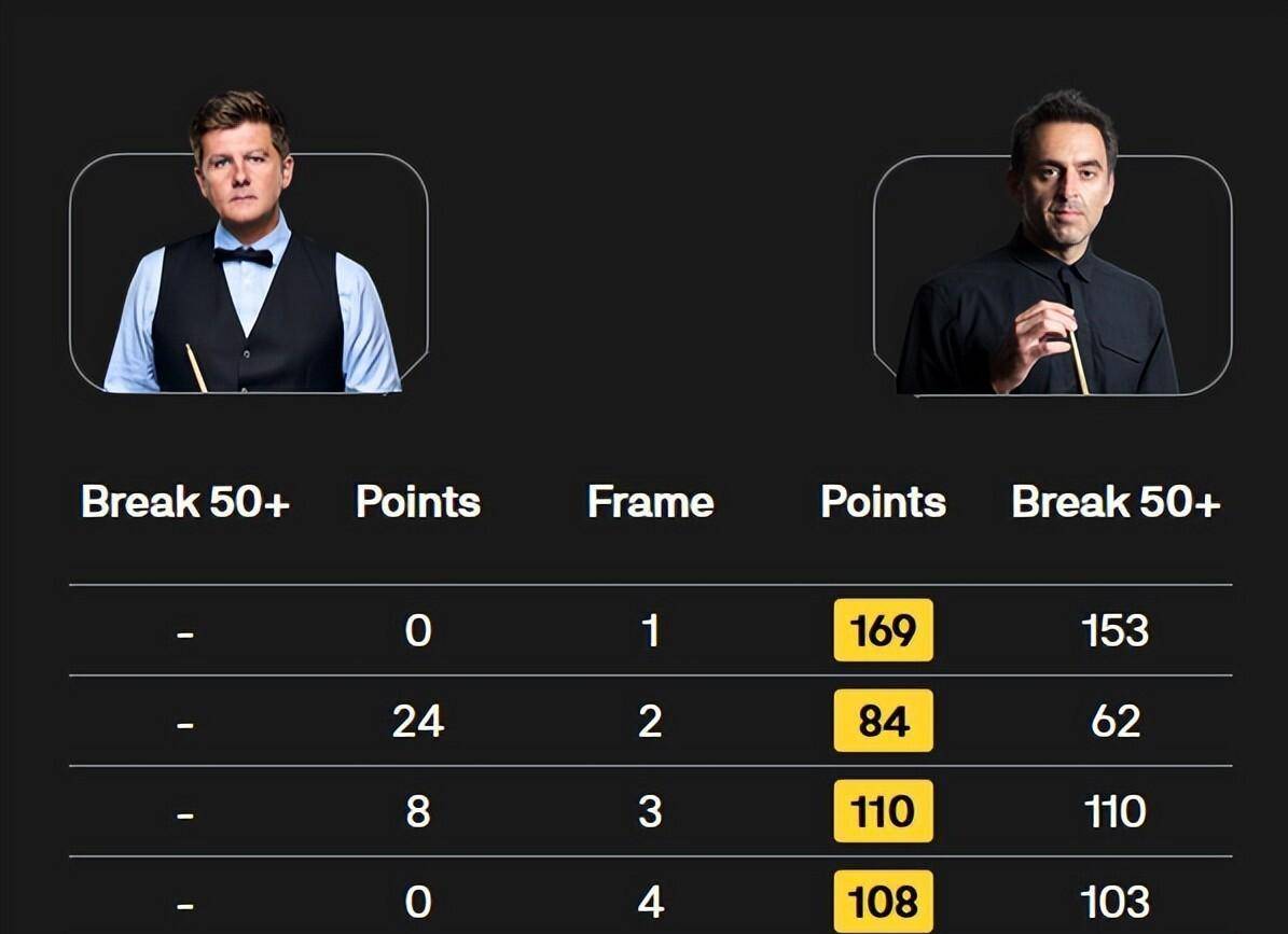 比赛没有因为这杆153分停下。 第二局,奥沙利文打出单杆62分。 第三局,他打出单杆110分。 第四局,单杆103分。 第五局,单杆95分收尾。 五局比赛,五杆高分,瑞恩·戴整场比赛坐在椅子上,几乎没有站起来的机会。