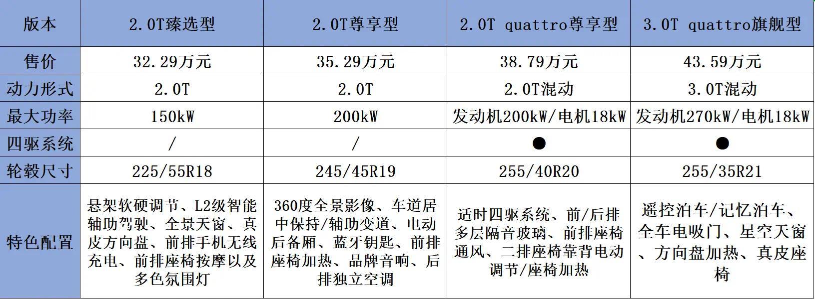 至于顶配的3.0T quattro旗舰型,它除了搭载有六缸发动机外,还额外增加了21英寸轮毂、遥控泊车/记忆泊车、全车电吸门、星空天窗、方向盘加热、真皮座椅等配置,虽然售价超过了40万元,但其43.59万元的指导价格与旧款车型的起售价格相差也只有不到10000元,这能够让不少消费者圆了自己的“六缸梦”,所以在我看来这一配置也并非摆设,其销量甚至有可能超过低配的2.0T臻选版。