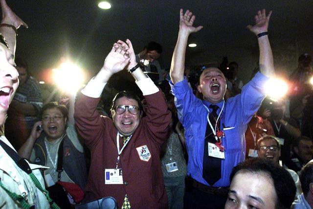 当萨马兰奇念出“北京”时,霍震霆激动地猛拍大腿。