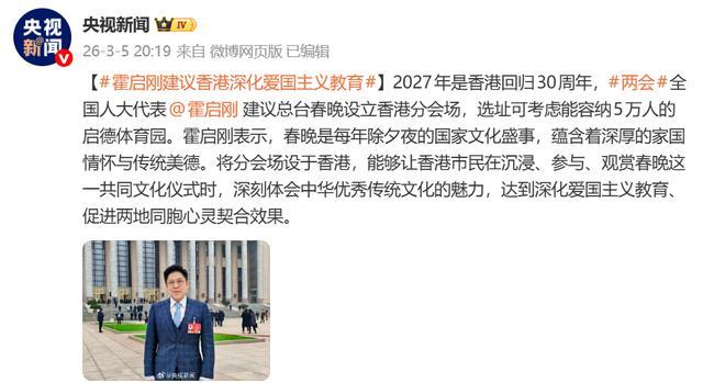霍启刚建议,总台春晚应该设立香港分会场。