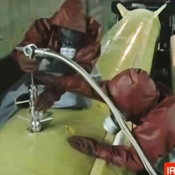 【伊朗导弹加注剧毒燃料,操作手着全套防毒服严阵以待】战斗紧张气氛一下子就上来了。伊朗弹道导弹操作手,一身全套防毒服加注液体燃料。