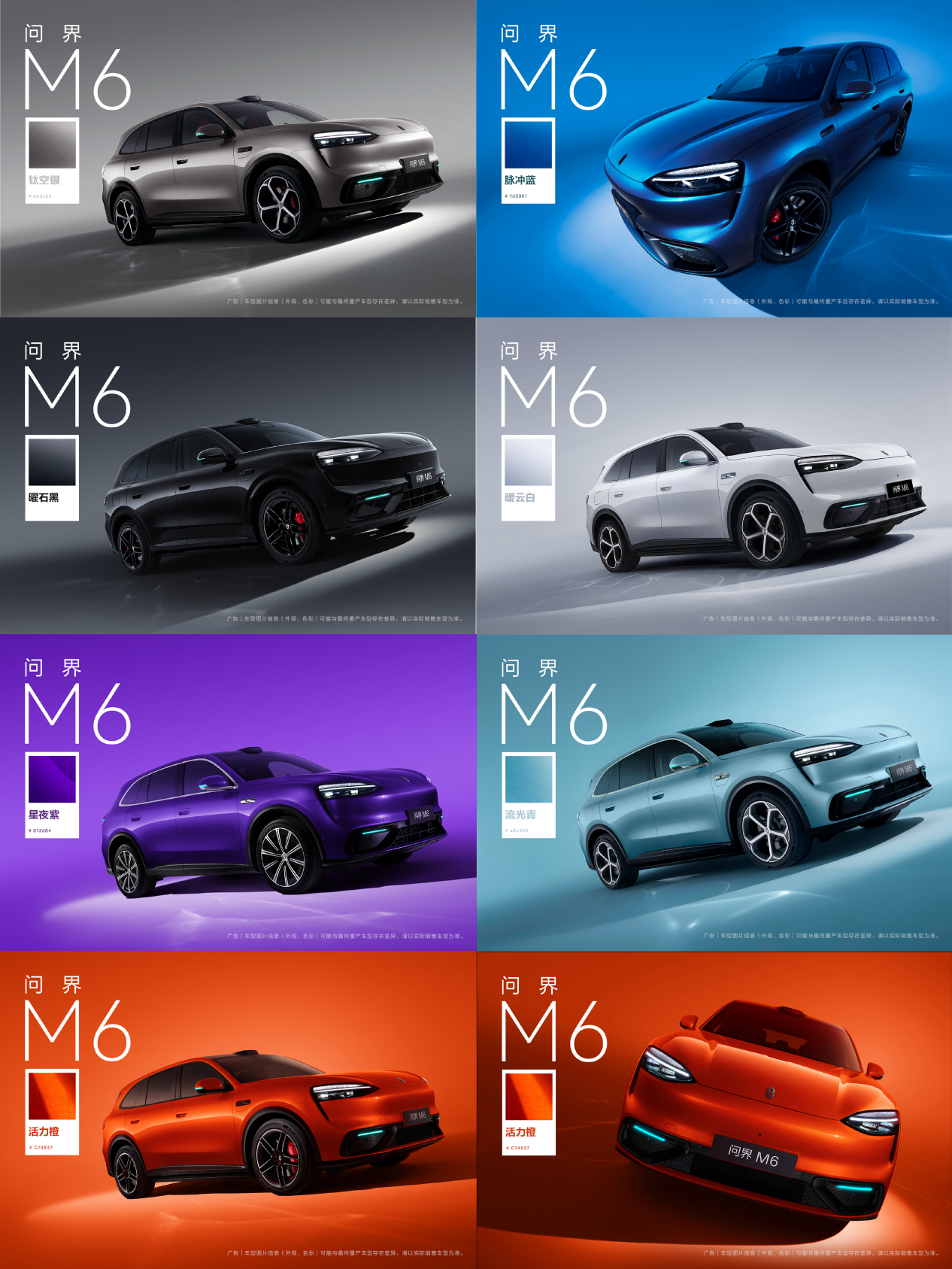 此前,官方公布了问界M6的7款外观配色,分别为灰、蓝、黑、白、紫、青、橙,而本组实拍图几乎展示了所有颜色,在小编主观看来,青色、黑色和白色应该会成为主销版本,黑色和白色不用多说,向来是不会出错的选择,至于青色这款看起来更时尚,又不至于太过张扬,而且跟小蓝灯也比较搭。大家喜欢哪种颜色?可以在评论区聊一聊。