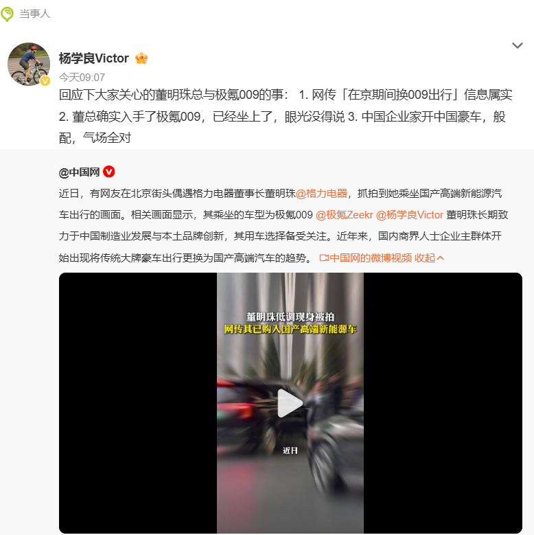 3月18日,吉利集团高级副总裁杨学良公开回应,确认该信息属实。他直言:“董总确已入手极氪009,中国企业家开中国豪车,般配,气场全对,眼光没得说!”