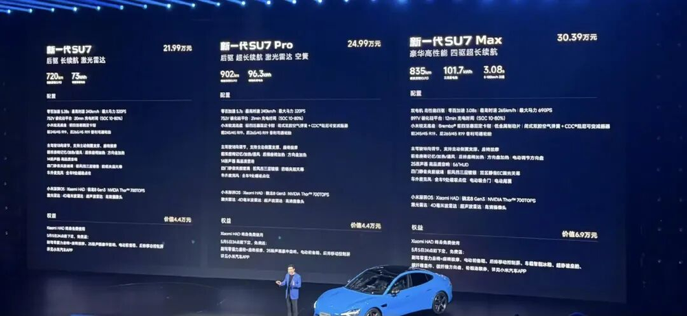 新一代SU7标准版21.99万元,Pro版24.99万元,Max版30.39万元,全系相比老款涨价4000元,但全系标配了800V高压平台和激光雷达,最高送6.9万权益,最快一周提车。